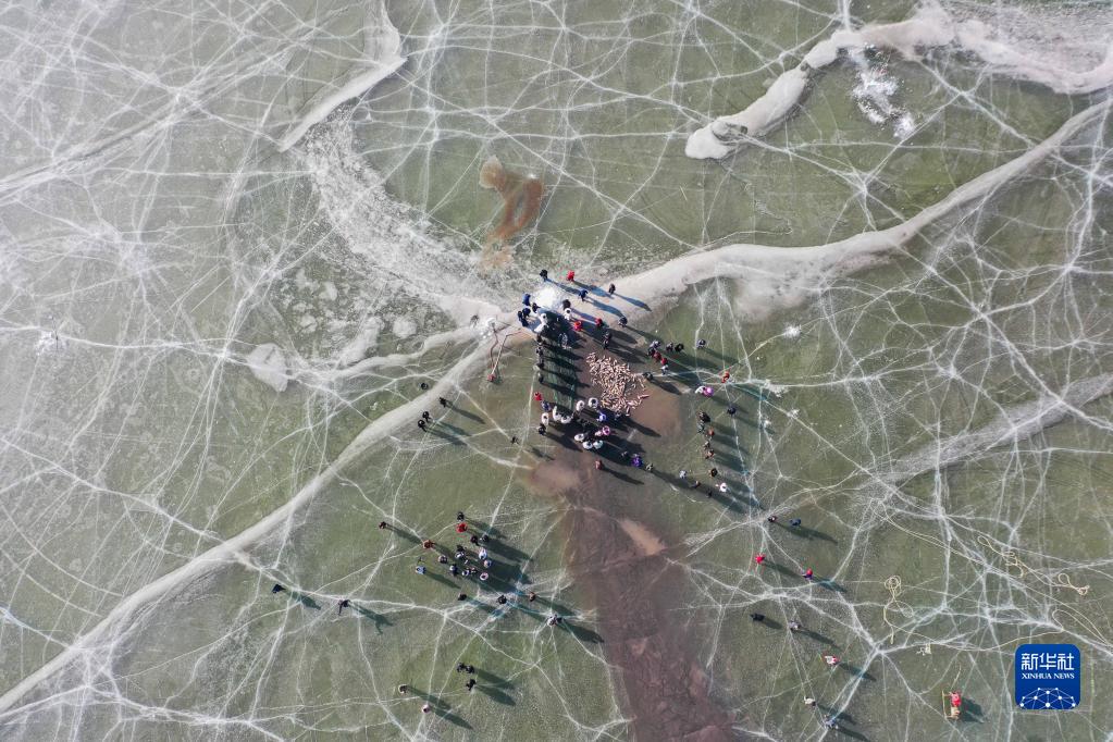 這是土默特左旗哈素海的冬捕現(xiàn)場(1月9日攝,無人機照片)。