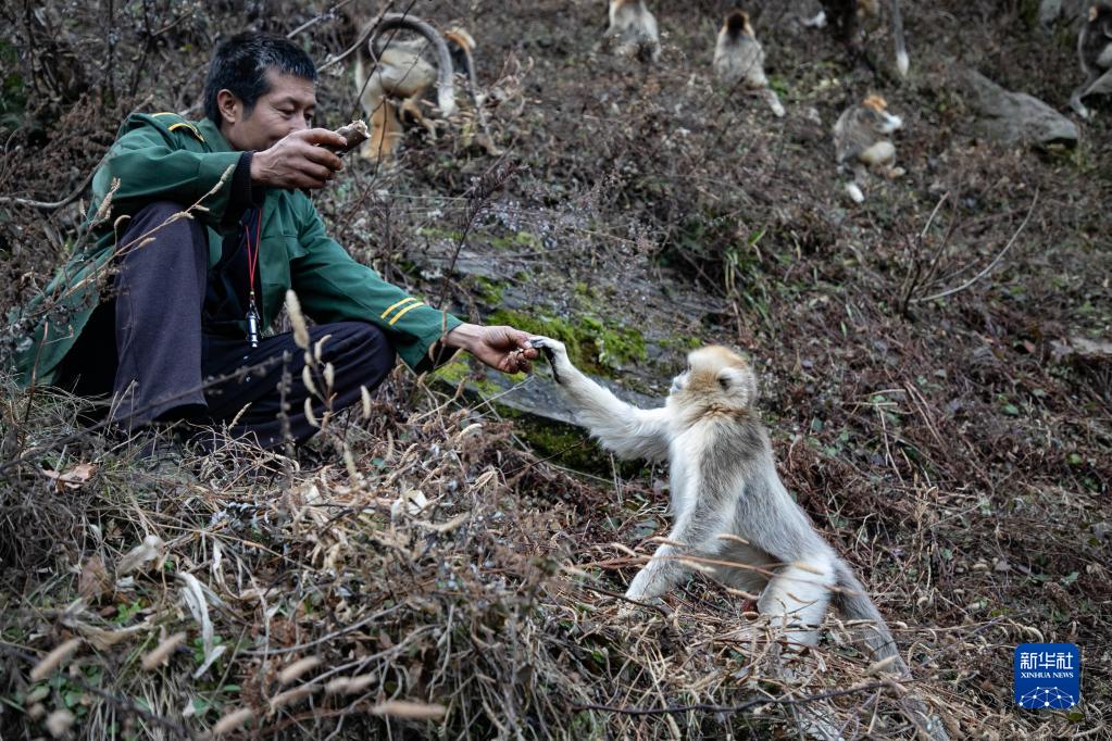 楊忠錄與大熊貓國家公園甘肅省片區(qū)裕河園區(qū)內(nèi)的川金絲猴互動(1月4日攝)。