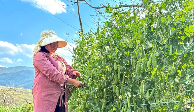 (甸坑村村民正在采摘水晶豌豆。楊運(yùn)/攝)