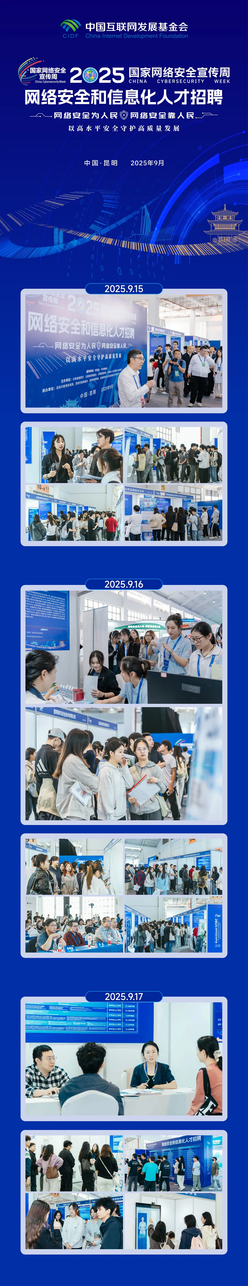 2025年9月15日至17日,教育部、中央網(wǎng)信辦指導(dǎo)的網(wǎng)絡(luò)安全和信息化人才招聘會(huì)在昆明滇池國(guó)際會(huì)展中心成功舉辦。本次活動(dòng)是由中國(guó)互聯(lián)網(wǎng)發(fā)展基金會(huì)網(wǎng)絡(luò)安全專項(xiàng)基金支持,以“滇峰網(wǎng)安職通未來”為主題,通過線下雙選會(huì)、校企對(duì)接宣講、線上平臺(tái)聯(lián)動(dòng)三大渠道,為2026屆相關(guān)專業(yè)畢業(yè)生及離校未就業(yè)畢業(yè)生打造對(duì)口就業(yè)“直通車”。