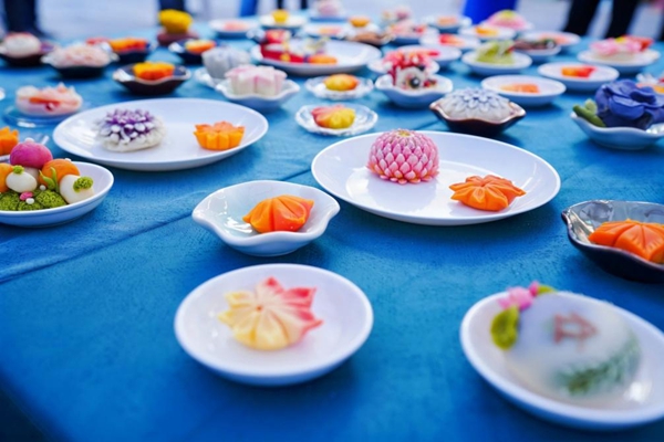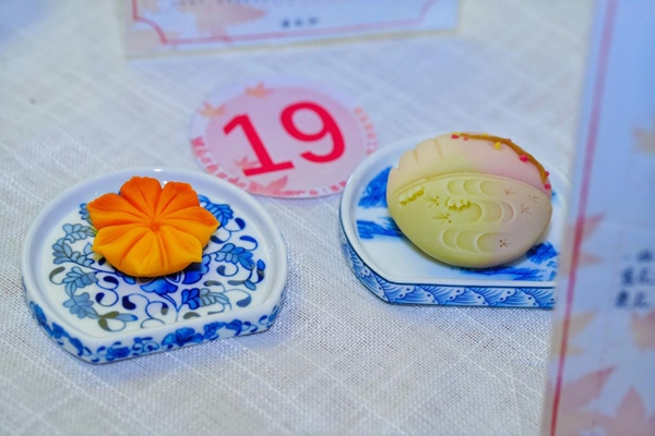 茶果子制作賽場(chǎng),則仿佛是凝固的藝術(shù)展。選手潘虹伽的作品《潭影梅魂》成為焦點(diǎn),她以團(tuán)扇為形,上部綴以赭褐老干與深粉寒梅,下部以青、黃兩色練切再現(xiàn)黑龍?zhí)丁扒鍧嶙苑帧钡钠嬗^,銀線勾勒的小魚若影游弋。“我把這條看不見的‘界’,做成可感知的味界、觸界、色界”,她希望這枚茶果子能讓品嘗者在方寸間讀懂昆明黑龍?zhí)肚甑淖匀粋髌?。這些作品無一例外,都深度錨定盤龍區(qū)的生態(tài)與文化元素,讓競(jìng)技超越了技術(shù)比拼,成為一場(chǎng)深刻的文化表達(dá)與創(chuàng)意展示。