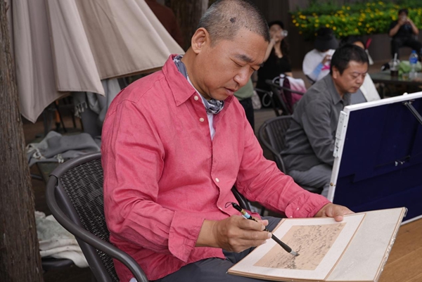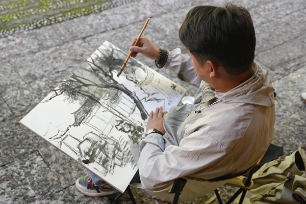 在黑龍?zhí)兜膶懮F(xiàn)場(chǎng),中國(guó)藝術(shù)研究院博士、李可染畫院終身研究員聶松的創(chuàng)作方式獨(dú)樹一幟。與其他畫家不同,他始終使用極淺的淡墨作畫,畫面如薄霧輕籠,卻層次分明,墨色具親和力。淡墨看似簡(jiǎn)單,實(shí)則需要深厚的功底支撐。聶松解釋道:“這需要從書法開始積累手上力道。下筆時(shí)墨雖淡,但要力透紙背?!痹谒墓P下,遠(yuǎn)山近水、亭臺(tái)樹木,皆以極其精微的墨色變化展現(xiàn),仿佛將麗江的靈秀之氣輕攏慢捻,化作紙上煙云。