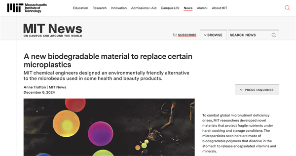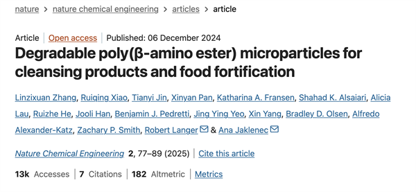 在MIT的五年博士生涯中,張林子鉉聚焦于一個(gè)核心問(wèn)題:如何通過(guò)新型材料的研究與應(yīng)用,將實(shí)驗(yàn)室創(chuàng)新轉(zhuǎn)化為能夠真正服務(wù)社會(huì)的解決方案。她與團(tuán)隊(duì)開(kāi)發(fā)了一類可降解的聚合物微?!郏é?氨基酯)(PAE)。這類材料能實(shí)現(xiàn)對(duì)多種微量營(yíng)養(yǎng)素(包括維生素A、維生素D、維生素E、維生素C、鋅和鐵)的穩(wěn)定化與控釋,使其在烹飪和儲(chǔ)存中保持活性,并能在人體內(nèi)可控釋放,從而提升吸收效果。該技術(shù)為應(yīng)對(duì)“隱性饑餓”(hidden hunger)——即熱量攝入充足但缺乏必需微量營(yíng)養(yǎng)素所造成的營(yíng)養(yǎng)不良問(wèn)題提供了新的可能。相關(guān)研究發(fā)表于國(guó)際頂級(jí)期刊《Nature Chemical Engineering》。