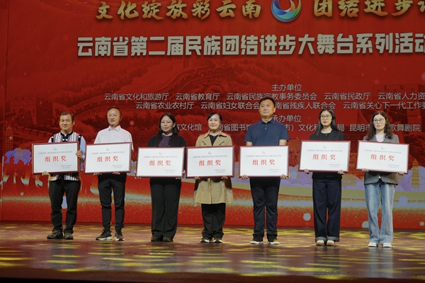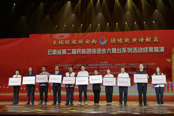 頒獎環(huán)節(jié),組委會對在系列活動中表現(xiàn)突出的單位授予“組織獎”與“優(yōu)秀組織獎”,表彰其在促進民族交往交流交融方面的積極作為。尾聲《踏歌彩云南》以磅礴的歌舞將晚會推向高潮,寓意各族兒女同心同行、共赴美好明天。