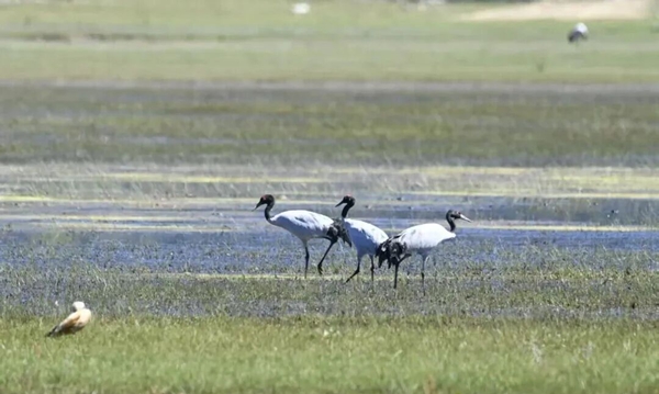 此刻的納帕海,水草豐茂,水面如鏡,優(yōu)雅的黑頸鶴或低頭覓食,或展翅踱步,與秋日暖陽構(gòu)成一幅和諧的生態(tài)畫卷。