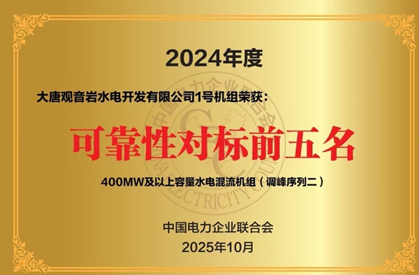 觀音巖水電公司1號(hào)機(jī)組獲全國(guó)發(fā)電機(jī)組可靠性對(duì)標(biāo)標(biāo)桿機(jī)組稱號(hào)