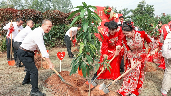 隨后的“植”子之手,共植“囍樹”環(huán)節(jié)則將浪漫誓言升華為扎根大地的長久承諾,新人們執(zhí)起鐵鍬,培土澆水,共同掛上許愿牌,精心種下了一片屬于他們的“同心林”。