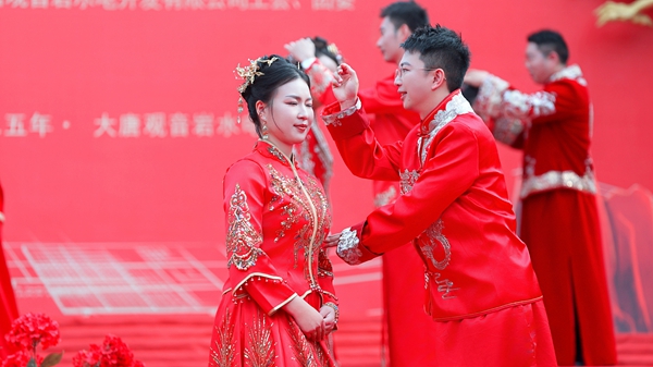 隨后的結發(fā)禮中,青絲纏繞封入鴛鴦錦囊;合巹禮上,新人交臂共飲金盞瓊漿……一系列古韻十足的喜慶莊重儀式將婚禮現(xiàn)場的氣氛逐步推向高潮,也把中華禮儀的深厚底蘊,繪成了此生難忘的畫卷。