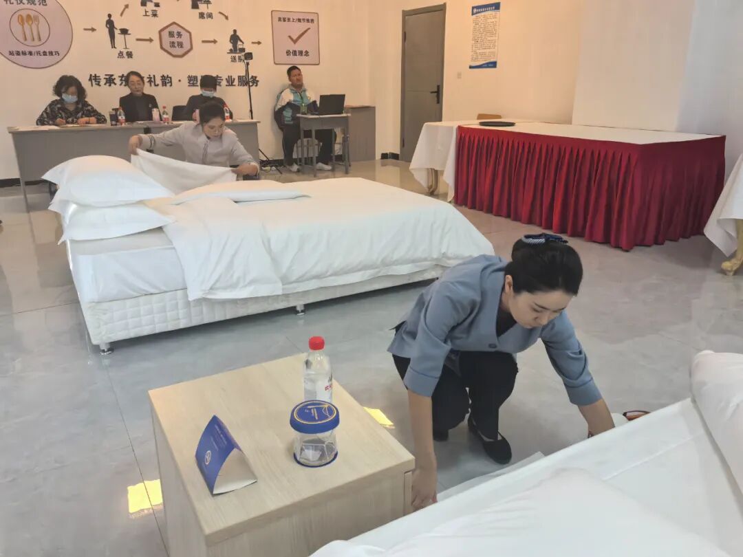 本次比賽分教師組與學(xué)生組,比賽項目涵蓋前廳接待服務(wù)、餐飲服務(wù)、客房服務(wù)三大核心賽項,全面對標(biāo)行業(yè)標(biāo)準(zhǔn)與崗位需求。在前廳接待服務(wù)賽項中,選手們快速響應(yīng)模擬客情,完成入住登記、房型推薦等全流程操作,既要展現(xiàn)嫻熟的系統(tǒng)操作技能,又要憑借得體的溝通表達(dá)與靈活的應(yīng)變能力滿足不同客人的個性化需求。餐飲服務(wù)賽項現(xiàn)場,選手們身著工裝,在中餐宴會擺臺過程中精準(zhǔn)把控餐具間距與擺放角度。餐巾折花環(huán)節(jié),選手們指尖翻飛,短短幾分鐘內(nèi)便折出多款造型別致的杯花,既美觀實用又貼合用餐場景??头糠?wù)賽項則考驗選手的細(xì)致度與實操功底,鋪床操作需在規(guī)定時間內(nèi)完成床單平整無褶皺、被角棱角分明、枕頭擺放對稱等要求,同時還要完成客房物品整理實操任務(wù),每一個細(xì)節(jié)都彰顯著專業(yè)素養(yǎng)。