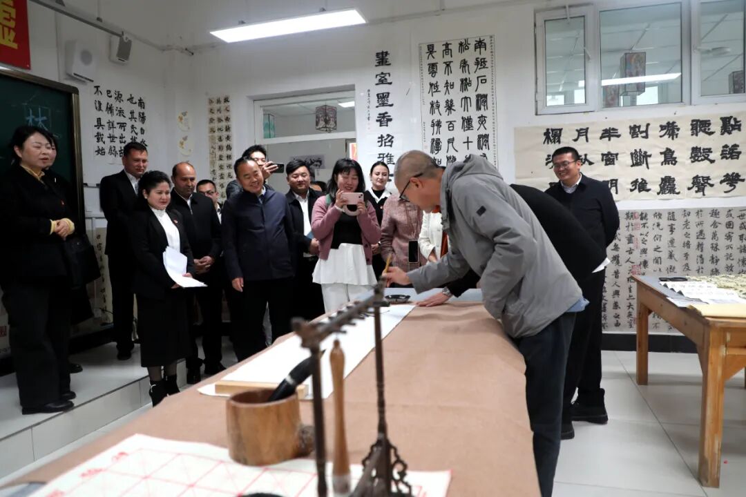 書法教室內(nèi)墨香裊裊,十余名學生凝神靜氣,專注地在宣紙上揮毫,從工整的楷書到流暢的行書,一幅幅充滿藝術(shù)韻味的作品依次陳列。代表們駐足細看,對學生的學習熱情和創(chuàng)作成果給予高度評價。