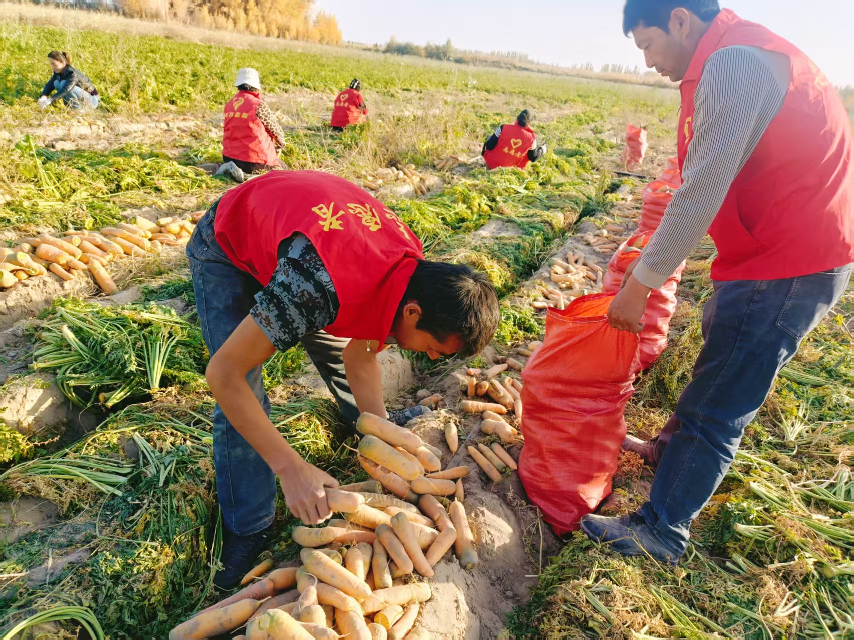 金秋時節(jié),于田縣托格日尕孜鄉(xiāng)烏尊博孜村的胡蘿卜種植基地里呈現(xiàn)出一派繁忙景象。由駐村工作隊隊員、村干部以及黨員志愿者共同組成的“紅色志愿隊”,在田間地頭開啟了胡蘿卜采收的“加速度”。