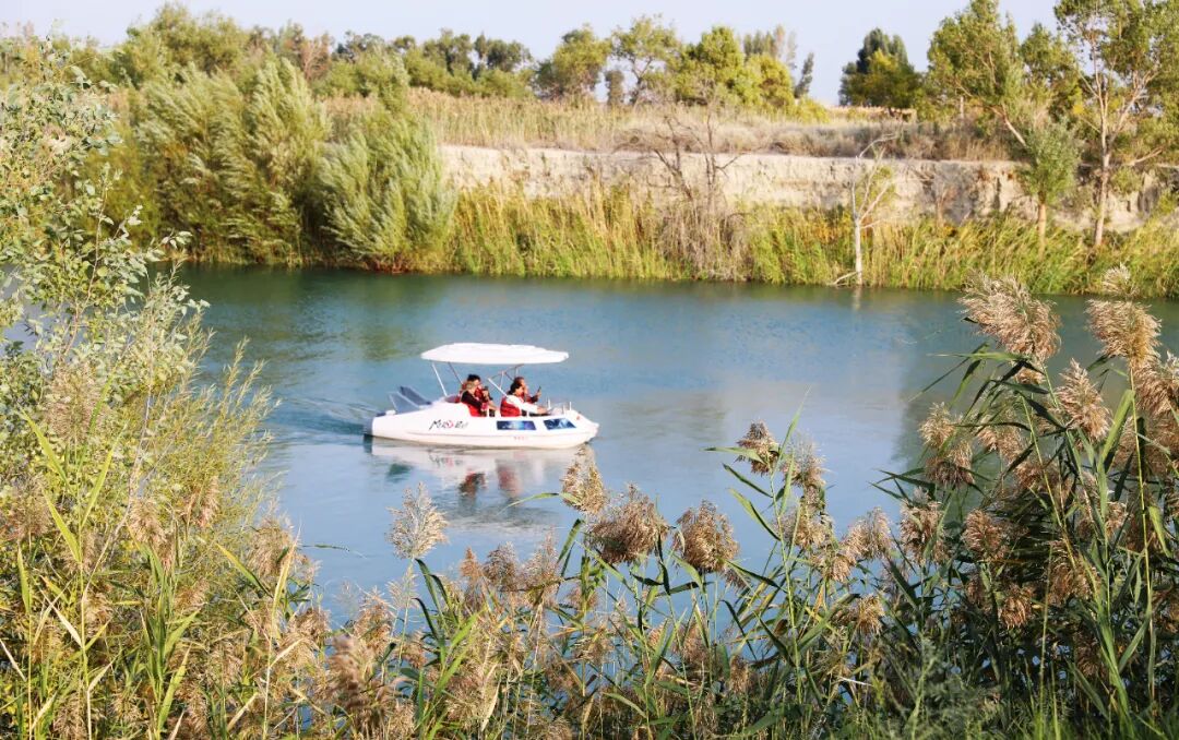 蘆葦、胡楊、紅柳在微風吹拂下左右搖擺,給蔚藍的湖面編織了一條美麗的彩帶,乘坐小船游覽,游客無不被碧波之上的美景陶醉。