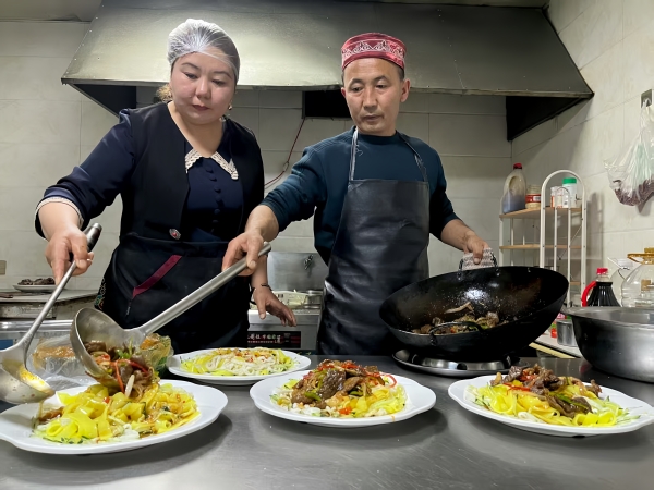 努爾亞西和丈夫經(jīng)營著一間小奶茶館。館里的奶茶香濃醇厚,手工馕、熏馬肉等特色美食地道正宗,可由于不會說國家通用語言,她只能接待本地熟客,生意始終不溫不火?!翱粗鴦e處的餐館客人絡(luò)繹不絕,我心里急啊?!迸瑺杹單髡f,在家人鼓勵(lì)下,她下定決心攻克語言難關(guān)。