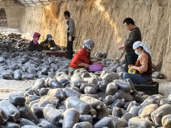 白楊河鄉(xiāng)雙泉村社員與村干部一起分裝菌包。潘安攝