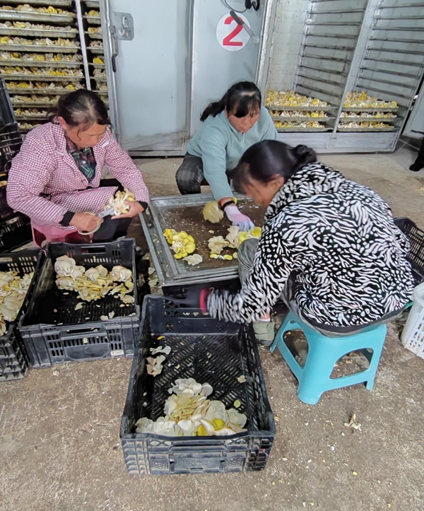 在施甸縣甸陽(yáng)鎮(zhèn)五福村,往日可能閑置的土地上,如今正躍動(dòng)著產(chǎn)業(yè)發(fā)展的脈搏。食用菌棒包裝生產(chǎn)線高速運(yùn)轉(zhuǎn),僅需一名工人操作,一個(gè)個(gè)標(biāo)準(zhǔn)的菌棒便通過(guò)傳送帶整齊輸出;一旁的烤房里,幾名婦女正熟練地分揀著新鮮的雞油菌,準(zhǔn)備烘烤。室內(nèi)忙碌的生產(chǎn)場(chǎng)景,與廠房外連綿的大雨形成了鮮明對(duì)比,絲毫未受影響。