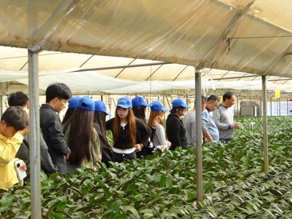 芳菲花苑種植基地作為當(dāng)?shù)鼗ɑ墚a(chǎn)業(yè)的標(biāo)桿,集花卉培育、種植、加工、包裝與市場(chǎng)流通于一體,形成了完整的產(chǎn)業(yè)鏈條。在基地創(chuàng)始人、學(xué)校校友閆照春的帶領(lǐng)下,師生一行實(shí)地走訪了花卉種植大棚、保鮮車間與產(chǎn)品展示區(qū),深入了解現(xiàn)代化花卉產(chǎn)業(yè)的運(yùn)營模式與發(fā)展前景。
