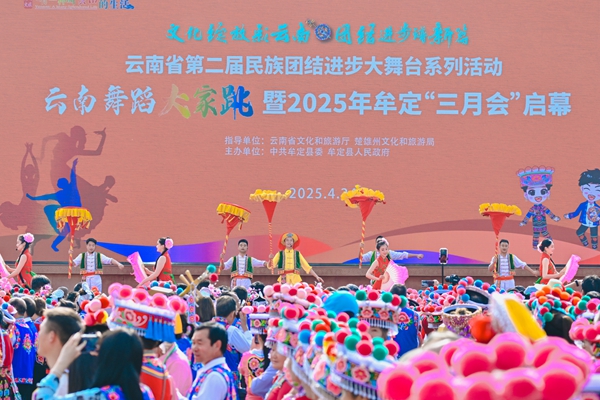 4月24日,春意盎然、繁花似錦的云南省楚雄州牟定縣城鑼鼓喧天、人潮如織。云南省第二屆民族團(tuán)結(jié)進(jìn)步大舞臺(tái)系列活動(dòng)——“云南舞蹈大家跳”暨2025年牟定“三月會(huì)”系列活動(dòng)在這里啟幕。