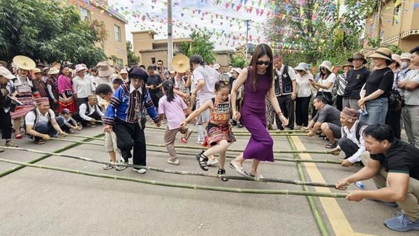 巡游結(jié)束后,竹竿舞互動環(huán)節(jié)將氣氛推向高潮。在花腰傣姑娘的指導(dǎo)下,游客們手拉手跳起歡快的舞步,“開、合、開開合”的節(jié)奏聲響徹村寨。