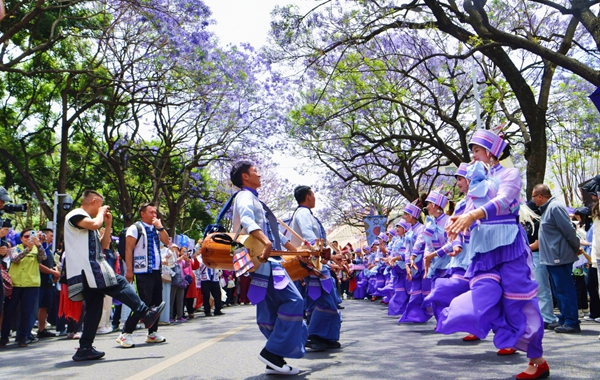 假日期間,石林風景區(qū)“撒尼奇韻迎遠客,一脈風情待君來”阿詩瑪迎賓巡游,從迎賓廣場出發(fā),途經(jīng)石林湖、遺產(chǎn)石、抵達日月廣場。身著絢麗服飾的撒尼人,以歌舞與笑容迎接游客,濃郁的民族文化氛圍撲面而來。迎賓廣場“煙火匯石海,技藝暖人間”阿詩瑪非遺文化集市,匯聚了刺繡、木雕、彩玉等精美手工藝品和土特產(chǎn)品,手工藝人現(xiàn)場展示制作,游客可體驗、選購,感受非遺魅力。日月廣場、蓮花池、天然舞場同步開展的“千年煙火凝一瞬,醉人彝風綻芳華”阿詩瑪生活片段展演,電影片段對歌、民俗接親表演等,為游客帶來沉浸式文化盛宴,現(xiàn)場氣氛熱烈。此外,“花楹織綺夢,靚影秀春城”阿詩瑪走進藍花楹快閃活動,在昆明市教場中路、藍花楹主題公園沿線、南屏街驚艷亮相,絢麗服飾與藍花楹美景交融,廣泛傳播石林阿詩瑪文化。