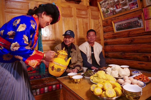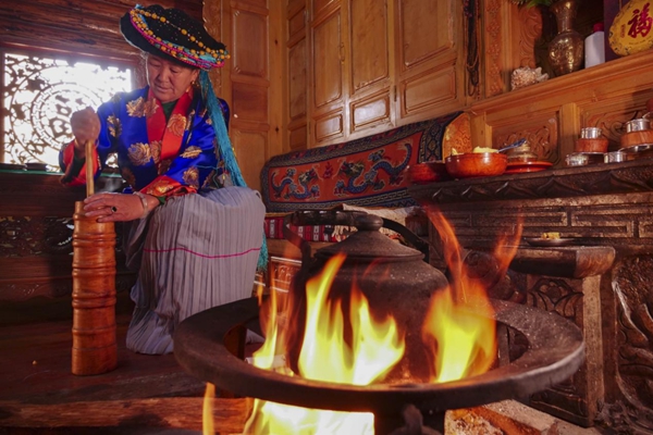 村里的晨霧還未散盡,酥油茶的清香便穿透了祖母屋的木楞墻。茶汁與酥油在“吭哧吭哧”的撞擊聲里交融,木杵每搗一下,火塘里的松柴就爆出幾點星火,仿佛在為這古老韻律打著節(jié)拍??甥}可甜的酥油茶也能匹配各種人的喜好;如果你還喜歡堅果拼配,那么核桃仁、花生碎也會成為酥油茶里畫龍點睛的調(diào)味品。滾燙的酥油茶散發(fā)著迷人的香氣,濃醇的茶湯表面浮著琥珀色油花,倒映著火塘上懸掛的豬膘肉。隨即遞上水汽粑粑,麩皮混著蕎麥香在晨光里發(fā)酵,配著酥油茶,一嘴咬下去,滿滿的幸福滋味。