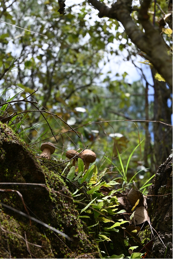 清晨,跟隨當(dāng)?shù)亟?jīng)驗(yàn)豐富的“菌子獵人”,穿梭在彌漫著泥土與草木混合清新氣息的山林中,一場(chǎng)尋“野”之旅由此開(kāi)啟。尋覓采摘一朵野生菌,是驚喜交織的奇遇。松軟的腐葉層下,可能藏著褐黃的牛肝菌,當(dāng)竹耙輕輕撥開(kāi)潮濕的落葉,菌蓋邊緣微微卷起的弧度映入眼簾,仿佛大自然精心雕琢的藝術(shù)品。