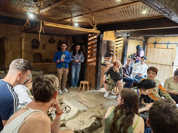 在哈尼梯田文化博物館,代表團在講解員的引領(lǐng)下,深入探尋哈尼族悠久的農(nóng)耕文明、“四素同構(gòu)”生態(tài)系統(tǒng),以及獨具特色的民族禮儀、歌舞服飾等文化精髓。通過豐富的實物展示、生動的影像資料與趣味互動,師生們深刻感受到哈尼族文化的獨特韻味,對哈尼族人民的智慧贊嘆不已,尤其是其“天人合一”的生存哲學(xué)。