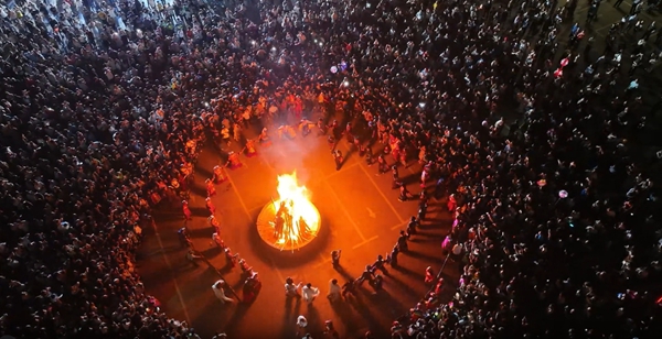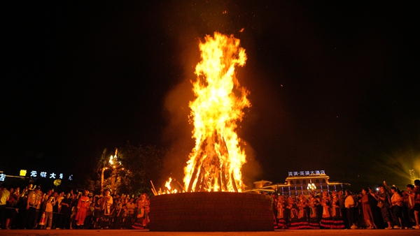 雄渾激昂的“過山號(hào)”響起,祭火儀式正式開始。彝族畢摩身著傳統(tǒng)服飾,神情莊重,口中吟誦著古老的《畢摩經(jīng)》,隨著火把點(diǎn)燃,廣場上的人們牽起手,圍繞著火堆,跳起左腳舞,共同慶祝這一年一度的節(jié)日。火焰在夜空中跳躍,映照著人們喜悅的面龐,節(jié)日的喜慶氛圍彌漫在每一個(gè)角落。