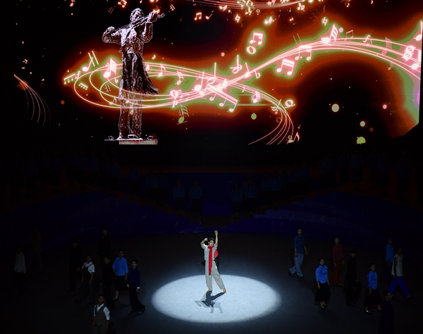 此次閉幕式演出以《山河音韻》《聶耳之光》《溪匯萬(wàn)象》《同心筑夢(mèng)》四個(gè)篇章,構(gòu)建起獨(dú)特的藝術(shù)敘事。序章《山河音韻》中,包含國(guó)家級(jí)非遺峨山彝族花鼓的80面民族鼓陣,與玉溪聶耳竹樂(lè)團(tuán)的民樂(lè)交相輝映,180°旋轉(zhuǎn)舞臺(tái)上聶耳銅像與撫仙湖日出、哀牢山脈影像交融,演繹山河氣韻,“聶耳文化”與“山河氣象”的深度融合,凸顯玉溪自然與人文交織之美。