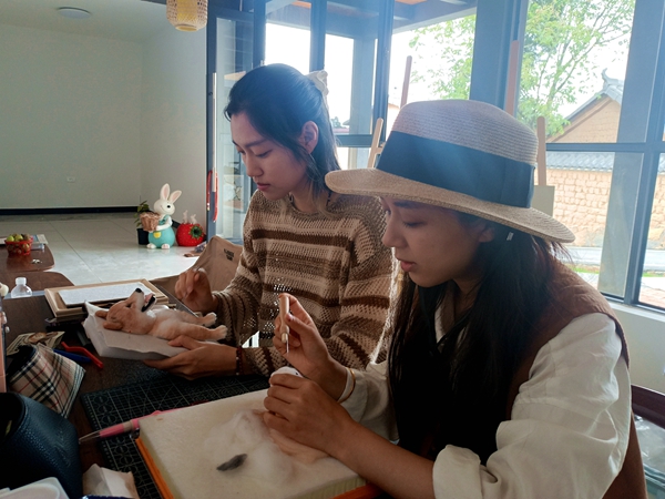 “喜歡這里的環(huán)境,喜歡這里的慢節(jié)奏生活,來這里‘躺平’。”來自重慶的小王說,她和來自天津的朋友小孫在楊外營旅居村租下一棟改造好的老房子,過起了旅居生活,成為當地的“新村民”。兩人喜歡毛氈作品,就以手工制作毛氈作品為業(yè)。平日里,線上接單后,就在線下制作。閑暇時,就到村里四處逛逛,消磨時光。