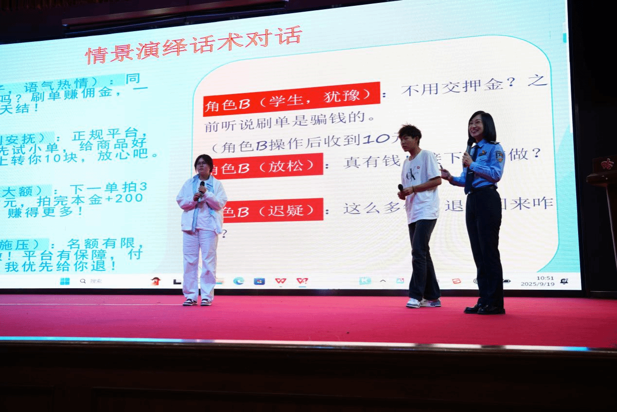 活動(dòng)開(kāi)場(chǎng),由公安干警帶來(lái)的三句半表演《校園反詐普法》迅速點(diǎn)燃了現(xiàn)場(chǎng)氣氛。這種源于民間的曲藝形式,以其詼諧的語(yǔ)言、明快的節(jié)奏和朗朗上口的內(nèi)容,將枯燥的法律條文和詐騙套路轉(zhuǎn)化為一個(gè)個(gè)生動(dòng)的笑料和警示。在輕松愉快的氛圍中,讓“刷單兼職是陷阱”、“冒充客服要警惕”等核心反詐知識(shí)點(diǎn)深入人心。