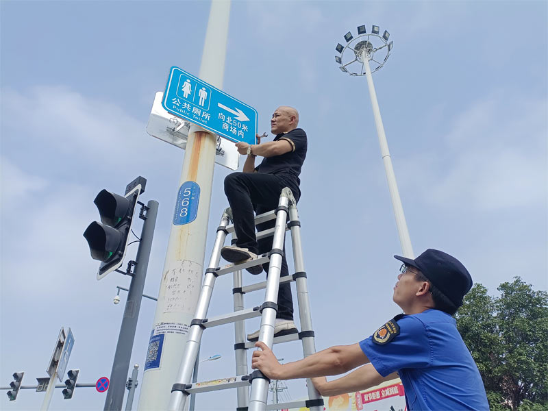 10月9日上午,在北二環(huán)與四里河路交叉口,施工人員將一塊掉漆褪色的舊公廁指示牌卸下,換上了嶄新的雙面居中抱箍式導(dǎo)視牌?!靶屡谱佑至劣智宄还庹?guī)奖懔?,看著也比以前結(jié)實(shí)安全!”家住附近的市民李女士駐足查看時(shí)連連稱贊。