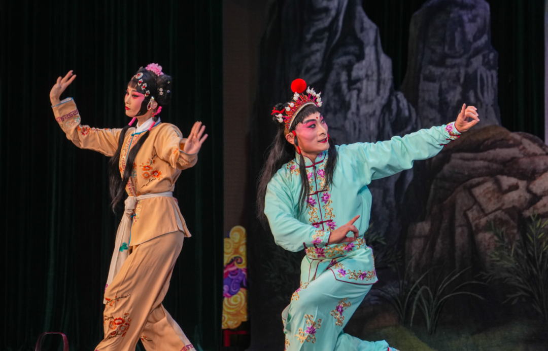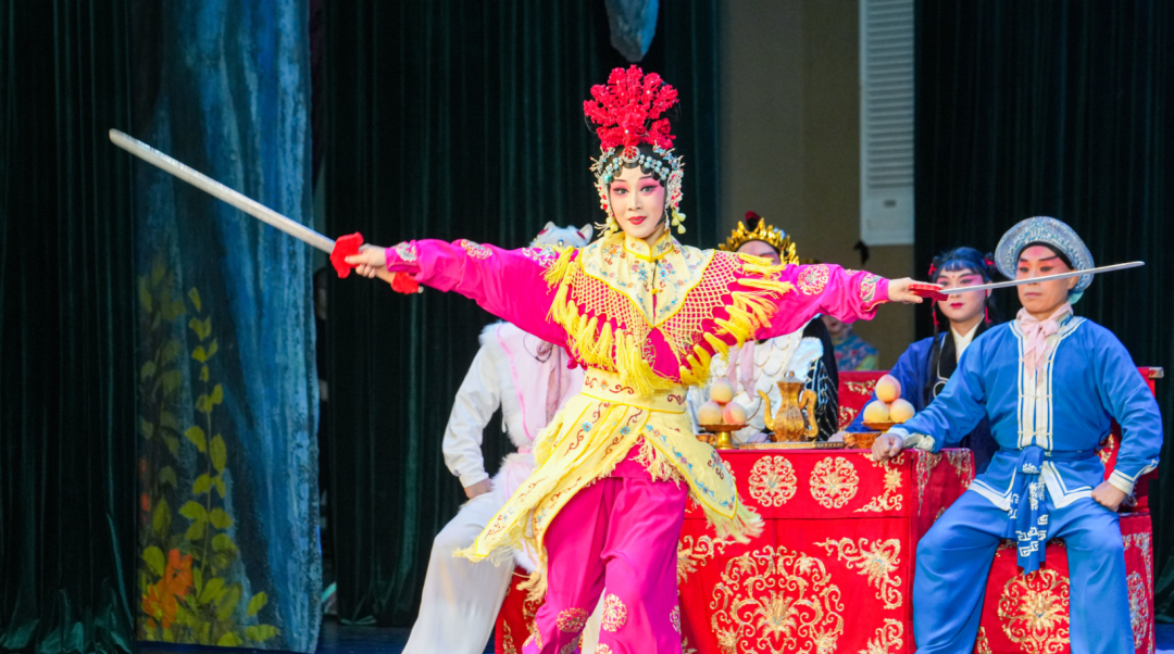 舞臺上,紅綢舞動如云霞流轉(zhuǎn),武術(shù)招式干凈利落,掃腿轉(zhuǎn)、白猿后空翻等武戲動作帶起颯颯風聲,剛?cè)嵯酀g,盡顯河北梆子獨特的藝術(shù)魅力。