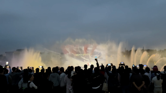 夜幕降臨,西區(qū)勝利廣場(chǎng)在景觀燈的點(diǎn)綴下流光溢彩。船尾造型的露臺(tái)伸向星湖,猶如一艘蓄勢(shì)待發(fā)的巨輪,場(chǎng)景蔚為壯觀。在眾人的期待中,伴隨著激昂的音效,熾熱的焰火劃破夜空,從星湖中噴薄而出,在空中綻放出絢麗圖景。緊接著,密集的水柱直沖云霄,如銀河傾瀉,構(gòu)成寬幅水幕。肥東名人故事與城市地標(biāo)在光影中躍動(dòng),化作流動(dòng)的畫卷,為游客獻(xiàn)上一場(chǎng)融視覺震撼與悠揚(yáng)樂章于一體的視聽盛宴。