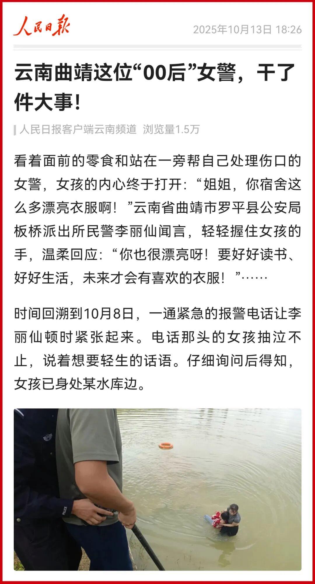 10月13日,《人民日報》客戶端以《云南曲靖這位“00后”女警,干了件大事!》為題,報道了羅平縣公安局板橋派出所民警李麗仙救落水女孩一事。