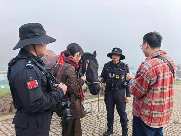 從“巡邏盲區(qū)”到“踏遍草山”,映射出的是派出所主防的初心。大海派出所所長(zhǎng)羅在華說(shuō)道:“以前車(chē)巡、步巡,20多萬(wàn)畝草山總有些‘死角’,偏遠(yuǎn)的山頂、深溝里的牧點(diǎn)根本到不了。騎警隊(duì)成立后,我們創(chuàng)新推出‘分片巡護(hù)、隨走隨防’的模式,將整個(gè)草山劃分為2個(gè)責(zé)任區(qū),每2名隊(duì)員負(fù)責(zé)一片區(qū)域,每天騎著馬沿著牧道巡邏,連最偏遠(yuǎn)的氈房都能走到?!辈萆侥撩窈陀慰鸵?jiàn)到騎著馬的騎警,爭(zhēng)相上前拍照打卡,與民警拉家常、說(shuō)安全、提建議,不僅拉近了警民之間的距離,更讓民警第一時(shí)間掌握了景區(qū)的治安狀況。草山牧民徐某說(shuō)道:“我們這里放牧都有個(gè)習(xí)慣,經(jīng)常把綿羊趕到山上后,十天半個(gè)月再上來(lái)看一次,雖然近年沒(méi)有發(fā)生羊群走失、被盜的案件,但有時(shí)還是不放心,自從有了騎警隊(duì),他們每天巡邏覆蓋了所有牧區(qū),我們更安心了?!?/p>