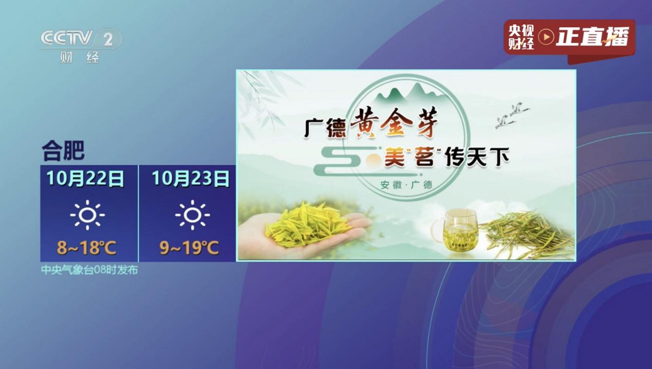 2025年10月22日,伴隨著CCTV-2《第一時(shí)間》城市天氣預(yù)報(bào)欄目的播出,廣德黃金芽以“廣德黃金芽美‘茗’傳天下”為主題的宣傳正式亮相,這標(biāo)志著廣德市農(nóng)業(yè)農(nóng)村局開啟了一場借助國家級(jí)媒體平臺(tái),向全國乃至全球推廣特色茶品的重要行動(dòng),同時(shí)也為廣德黃金芽的品牌發(fā)展與產(chǎn)業(yè)升級(jí)注入強(qiáng)勁動(dòng)力。