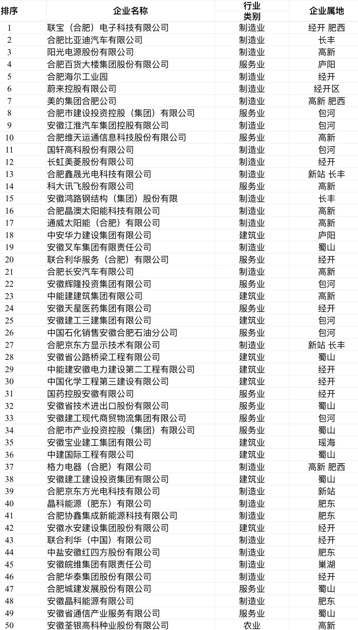 合肥企業(yè)50強(qiáng)榜單揭曉,聯(lián)寶比亞迪陽光電源包攬前三強(qiáng)