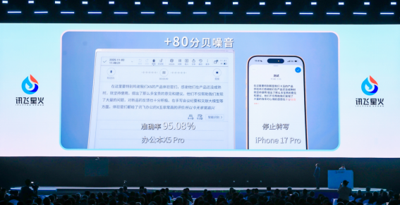憑借獨(dú)家“AI+麥克風(fēng)陣列技術(shù)”,訊飛智能辦公本X5通過(guò)首創(chuàng)的上4下4環(huán)八麥克風(fēng)陣列實(shí)現(xiàn)超強(qiáng)抗噪,識(shí)別效果遠(yuǎn)超iPhone 17 Pro,高噪環(huán)境下識(shí)別準(zhǔn)確率達(dá)95.08%;訊飛AI翻譯耳機(jī)首創(chuàng)單耳三麥多感融合降噪系統(tǒng),在復(fù)雜噪聲下識(shí)別準(zhǔn)確率高達(dá)97.1%;訊飛雙屏翻譯機(jī)2.0則獨(dú)創(chuàng)強(qiáng)降噪模式,在90dB噪音下識(shí)別率達(dá)98.69%。此外,業(yè)界首個(gè)軟硬一體的訊飛同傳麥克風(fēng)能實(shí)現(xiàn)自動(dòng)翻譯免切換,同傳播報(bào)首響延遲低于2s,支持私有化部署。