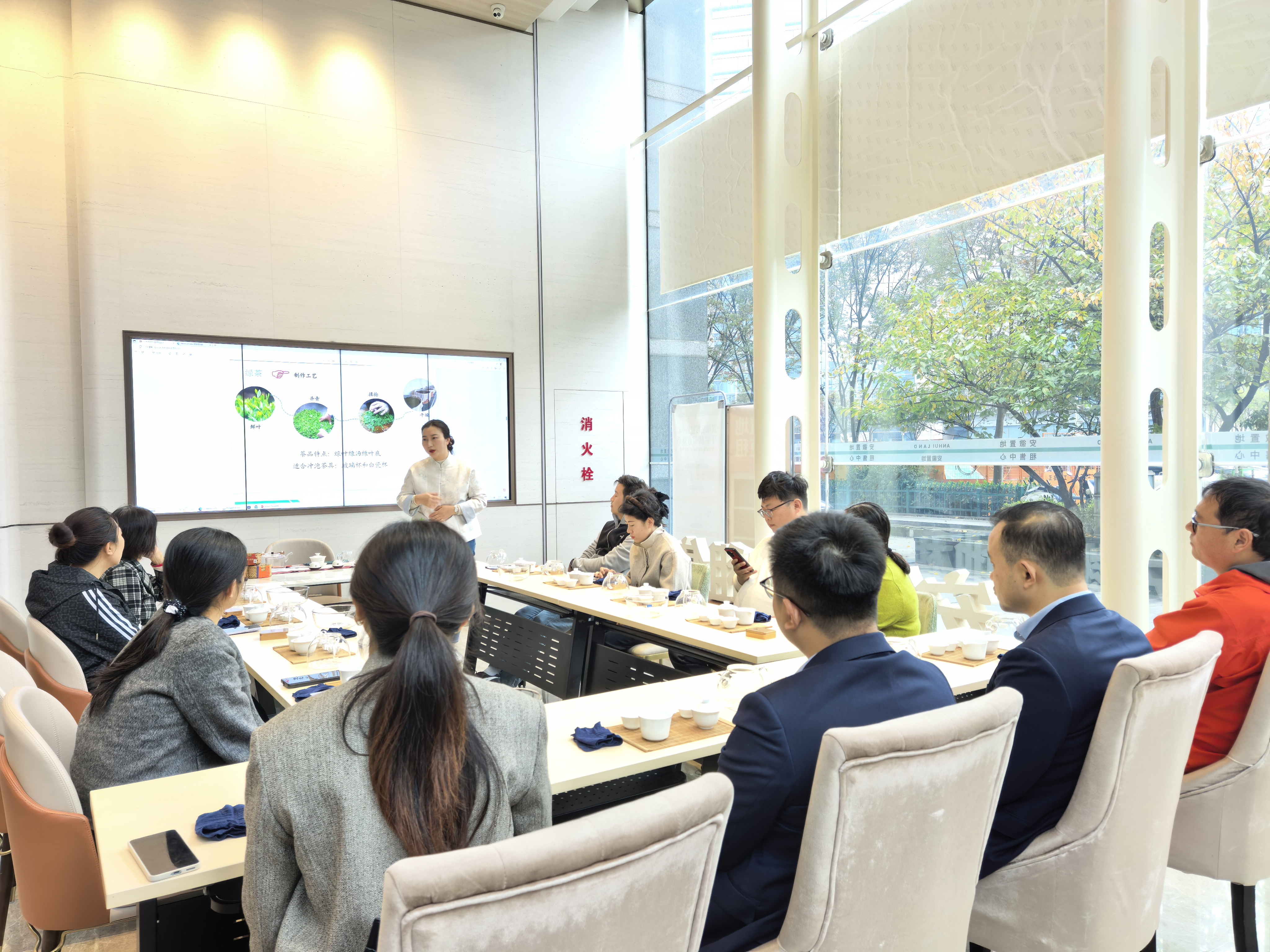活動(dòng)現(xiàn)場(chǎng),古琴悠揚(yáng),茶香氤氳。在雅致靜謐的氛圍中,專業(yè)茶藝師為到場(chǎng)嘉賓帶來(lái)了一場(chǎng)精彩紛呈的茶文化盛宴?;顒?dòng)主體分為茶藝表演與文化講座兩部分。茶藝師優(yōu)雅地展示了宋代點(diǎn)茶、蓋碗沖泡等傳統(tǒng)技藝,其行云流水的動(dòng)作引人入勝。隨后,通過PPT演示與實(shí)物對(duì)照,茶藝師系統(tǒng)講解了茶的起源、發(fā)展以及綠茶、紅茶、烏龍茶等六大茶類的特點(diǎn)與區(qū)別。同時(shí),她還細(xì)致介紹了茶壺、茶盞、茶則等茶具的用途與文化寓意,并親自示范了奉茶手勢(shì)、叩指禮等傳統(tǒng)茶道禮儀,讓參與者深刻體會(huì)到中國(guó)茶文化“禮”與“和”的精髓。