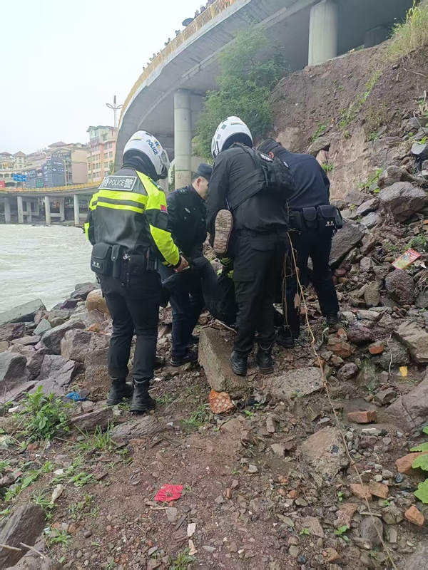 民警上前試圖喚醒男子,但該男子口吐污物,意識(shí)模糊,民警只好將其背起轉(zhuǎn)移到河堤下方的安全地帶。
