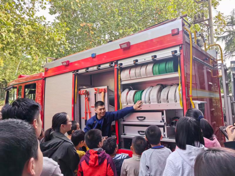 活動現(xiàn)場,消防員叔叔首先帶領(lǐng)青少年們參觀了消防車庫,詳細介紹了消防車的構(gòu)造、各類救援裝備的用途。從厚重的消防服到精密的破拆工具,從高壓水槍到空氣呼吸器,每一件裝備都讓孩子們充滿好奇,大家一邊認真聆聽講解,一邊積極提問,在觸摸與觀察中揭開了消防裝備的“神秘面紗”。