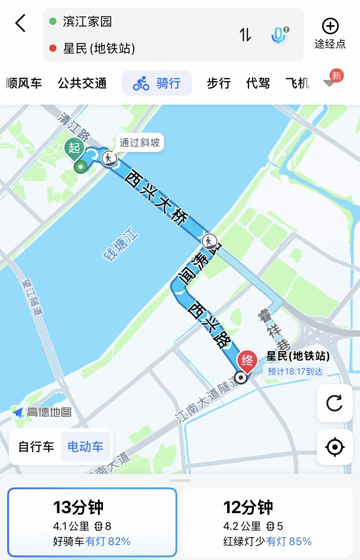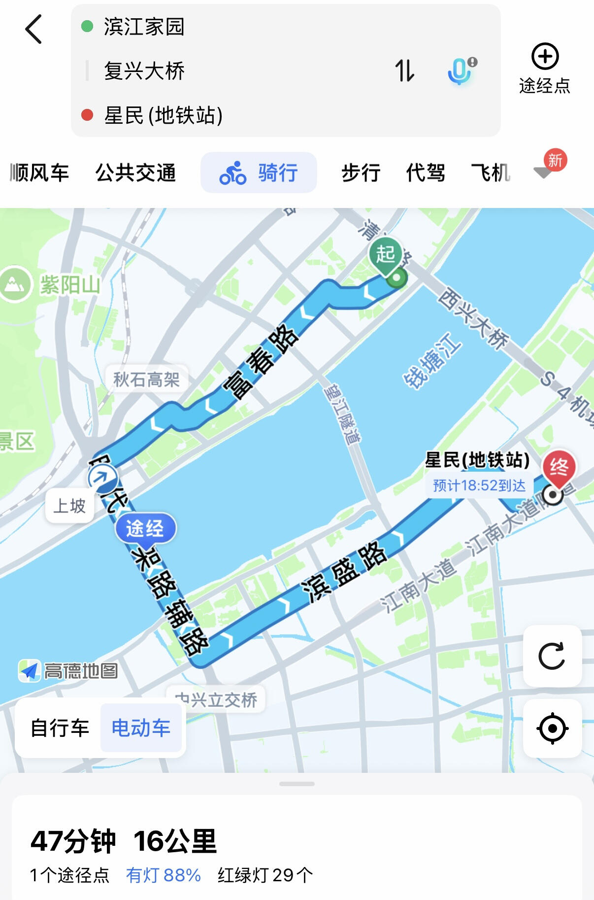 經(jīng)常開電瓶車或騎自行車過江的市民會發(fā)現(xiàn),若繞行,通勤路程可就遠了不止一倍。記者查詢發(fā)現(xiàn),原本電瓶車只需5-7分鐘即可通過錢江三橋,若繞行附近的復(fù)興大橋或彭埠大橋則路程增加約10公里,多耗時起碼半小時。