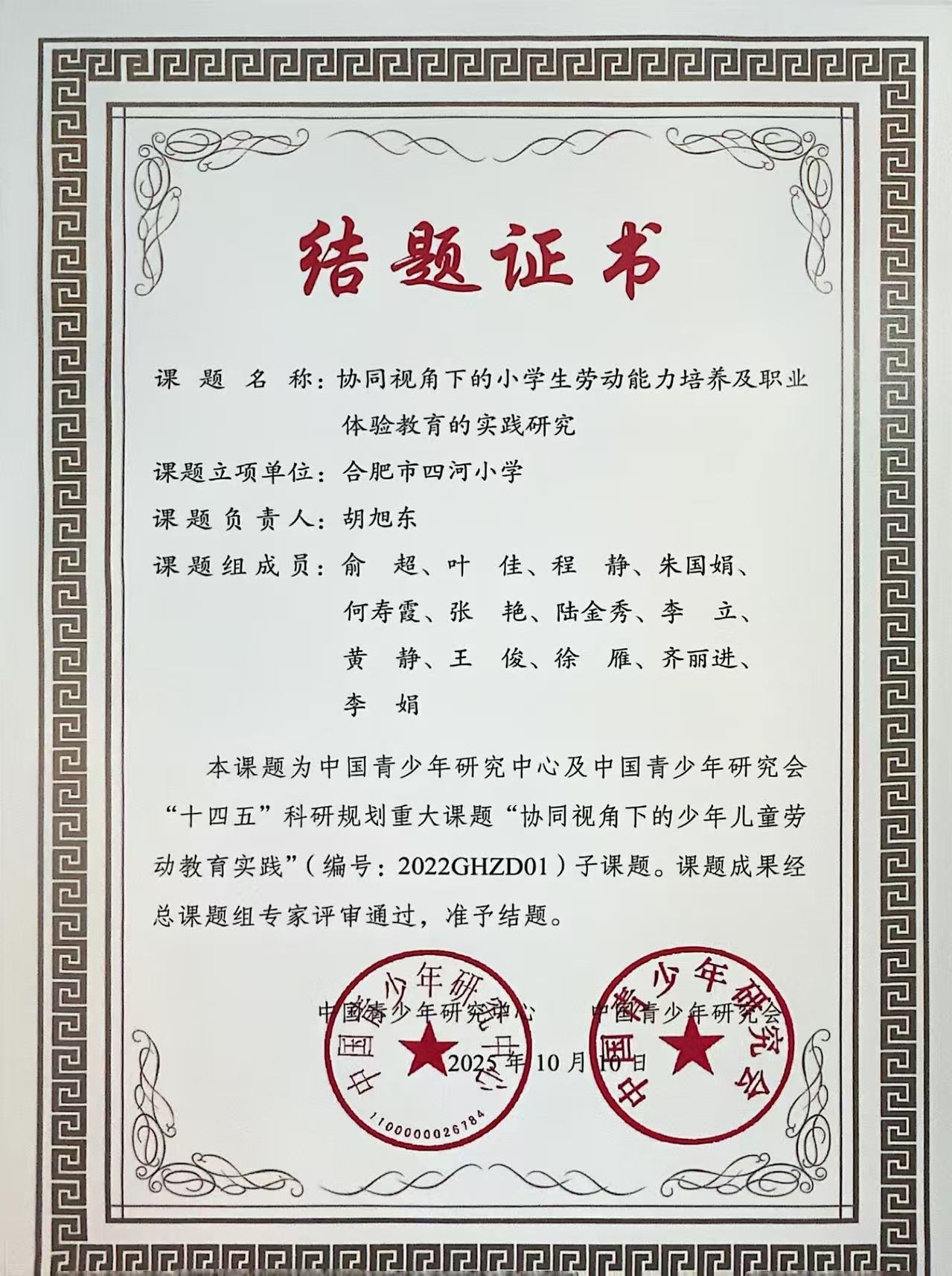 近日,合肥市四河小學(xué)收到中國(guó)青少年研究中心及中國(guó)青少年研究會(huì)頒發(fā)的結(jié)題證書,由胡旭東老師負(fù)責(zé)的課題《協(xié)同視角下的小學(xué)生勞動(dòng)能力培養(yǎng)及職業(yè)體驗(yàn)教育的實(shí)踐研究》,作為中國(guó)青少年研究中心及中國(guó)青少年研究會(huì)“十四五”科研規(guī)劃重大課題“協(xié)同視角下的少年兒童勞動(dòng)教育實(shí)踐”(編號(hào):2022GHZD01)子課題,經(jīng)總課題組專家評(píng)審?fù)ㄟ^(guò),準(zhǔn)予結(jié)題。