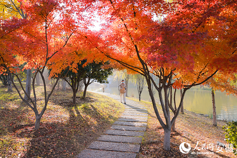 雙清灣公園內(nèi)一處林蔭小道,行人從火紅的楓林下經(jīng)過。人民網(wǎng)記者王曉飛攝